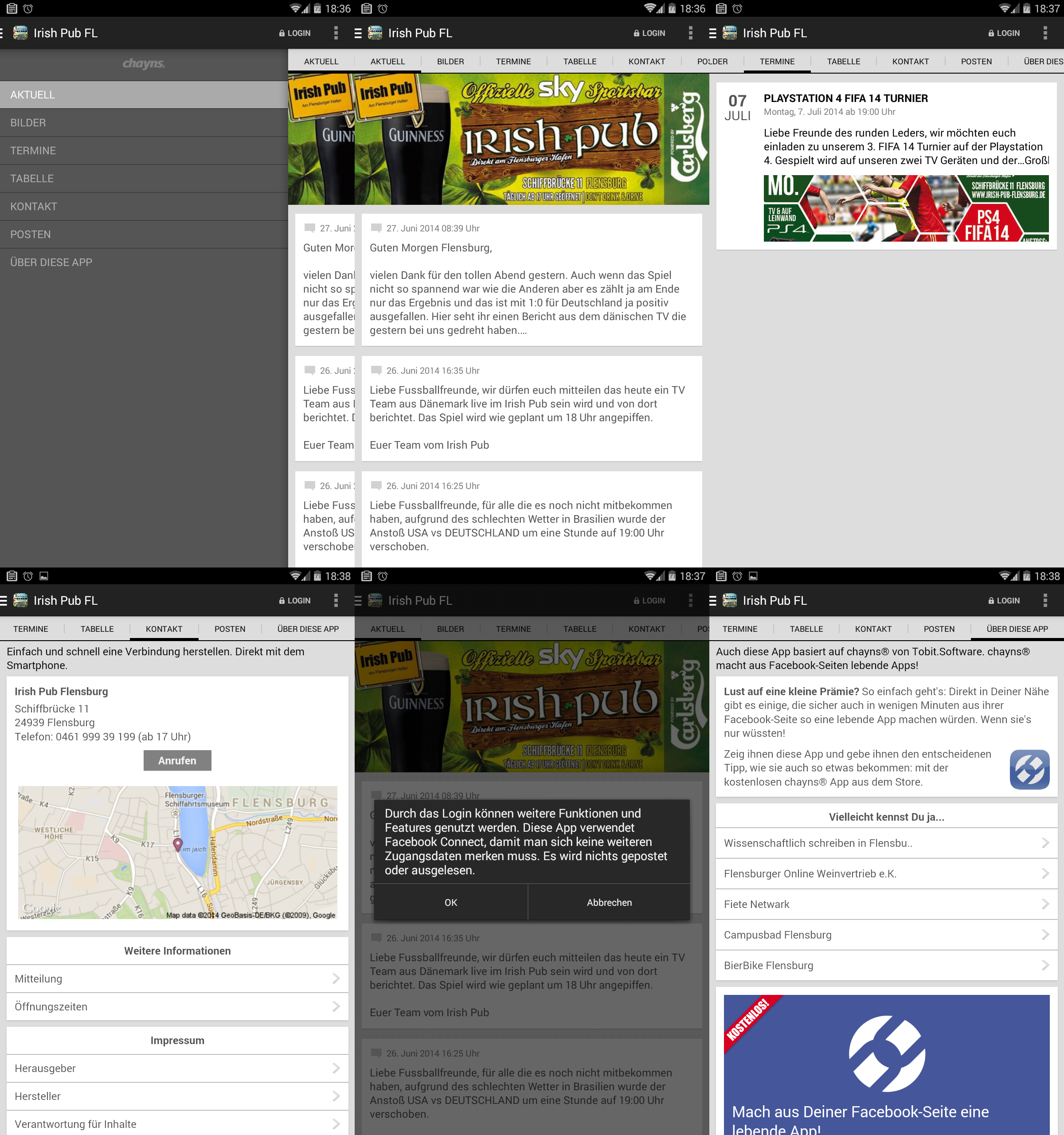 Die App des Irish Pub Flensburg nehme ich stellvertretend für hunderte andere Infoapps die mit chayns von Tobit erstellt wurden.
