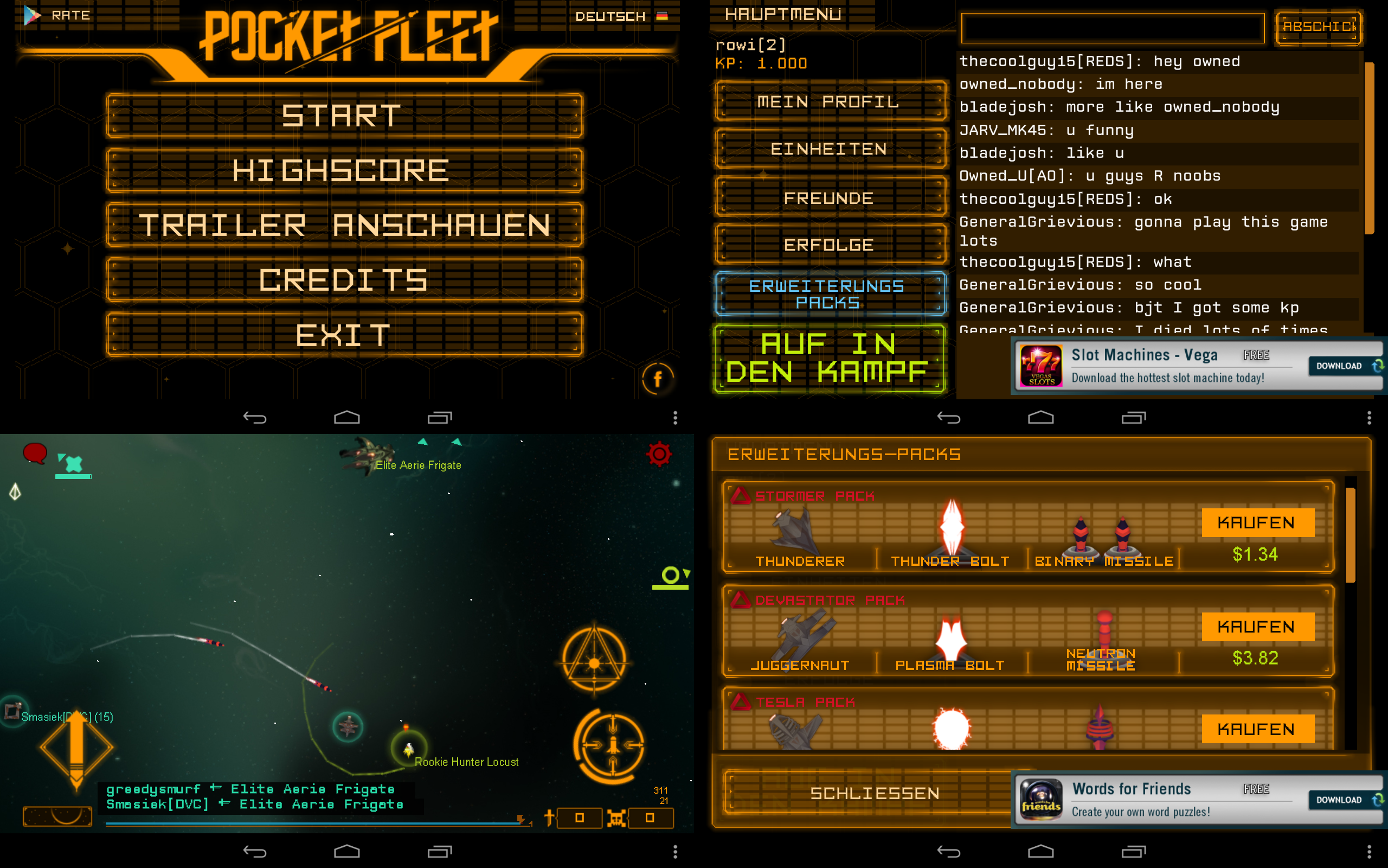 Pocket Fleet ist ein Online Multiplayer Arcade Shooter der grob an das klassische Asteroids erinnert. Man sieht sein Raumschiff von oben, über einen Knopf gibt man Gas. Zum steuern bewegt man das Telefon oder Tablet, das Raumschiff dreht sich dann entsprechend. Über Knöpfe am rechten Rand feuert man seine verschiedenen Waffen ab.