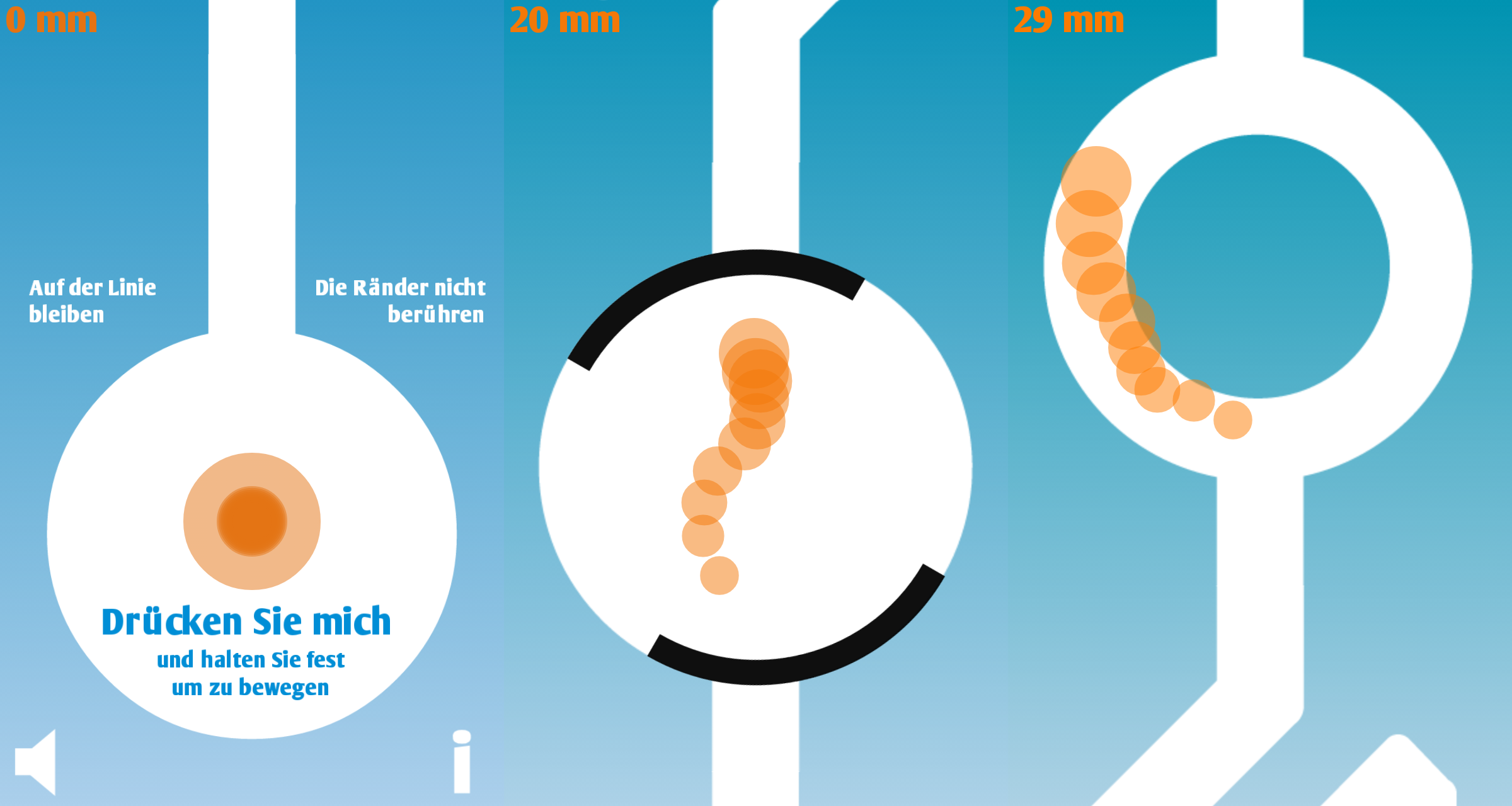 _Folgt der Linie_ ist ganz einfach, der Name ist Programm: mit dem Finger soll man einem Pfad folgen der auf dem Display von oben nach unten scrollt. Ganz einfach und ganz schwer. Die Linie macht Kurven, Kreise, es gibt Hindernisse und man verdeckt mit seiner Hand mit etwas Pech die Sicht.