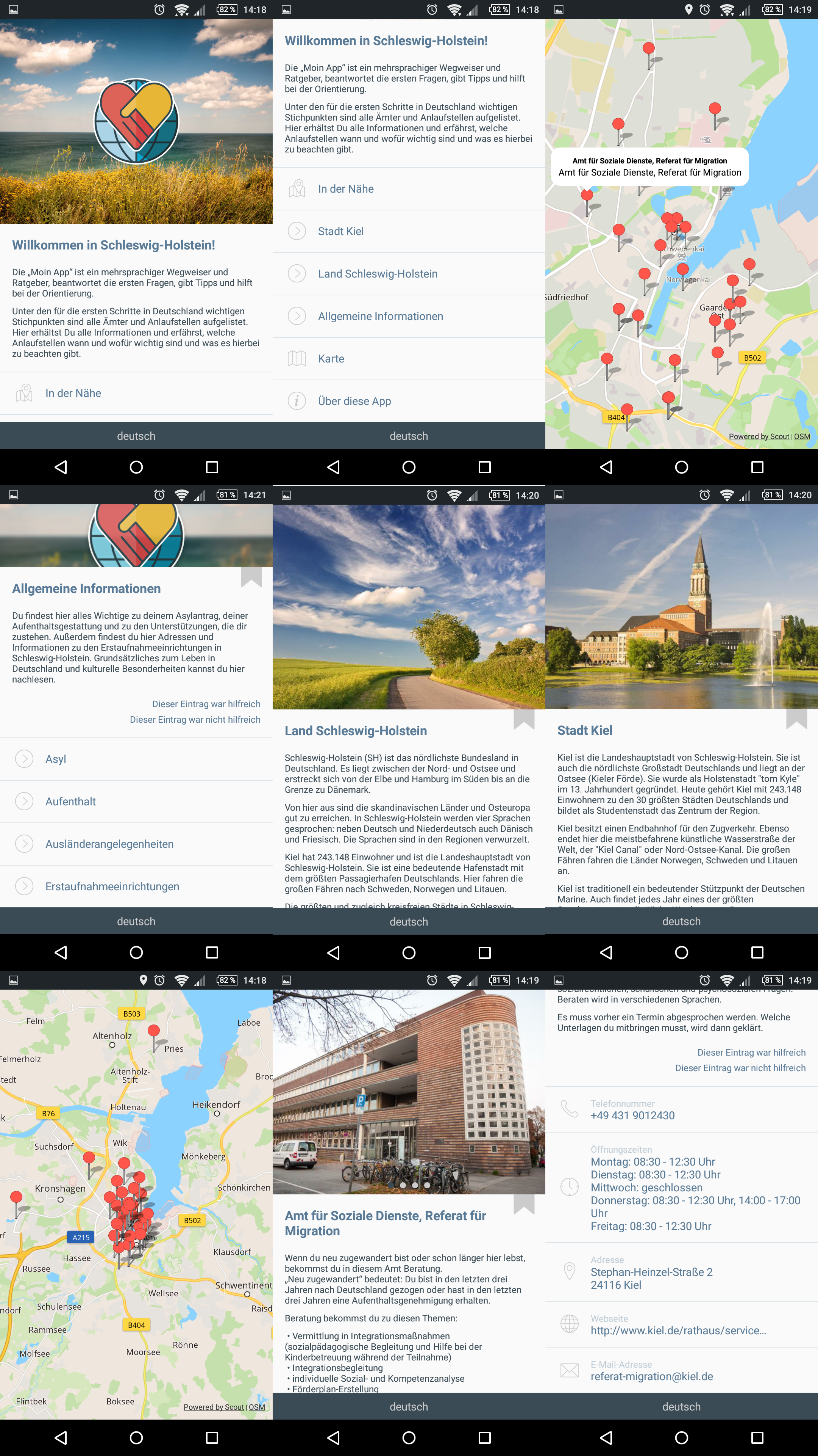 Mit Moin Refugee gibt es nun eine weitere Informationsapp die sich speziell anFlüctlinge in Schleswig-Holstein richtet. Sie ist (natürlich) Mehrsprachig und enthält erstmal alle relevanten Informationen was dasLand sowie Asyl usw. angeht. Dafür enthält sie selbstverständlich alle relevanten Adressen inklusive einer Karte die auch offline funktioniert. Wirklich sehr praktisch finde ich, dass alle wichtigen Gebäude als Foto abgebildet sind. Als Flüchtling in einem fremden Land und ohne ordentliche Kentnisse der Landessprache kann man sich zwar anhand einer Karte orientieren aber wenn man dann das konkrete Gebäude sieht ist es deutlich hilfreicher.