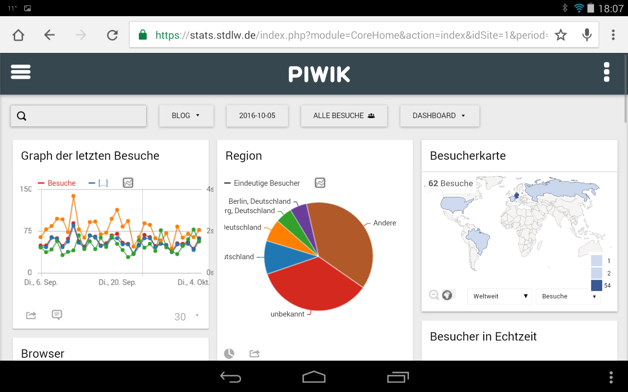 Angefangen hatte ich mit Version 0.5.4, bis vorhin lief hier mittlerweile die 2.16.4. Und nun habe ich vorhin die Beta von Piwik 3.0 installiert. Neben diverser Änderungen im Hintergrund (es soll u.a. schneller sein) gibt es eine neue Oberfläche, die basierend auf dem gewohnten Design der 2.x die Grundsätze des Material-Design umsetzt und auch mehr Responsive ist. Dadurch sieht es auf Tablets und Smartphones deutlich besser aus: