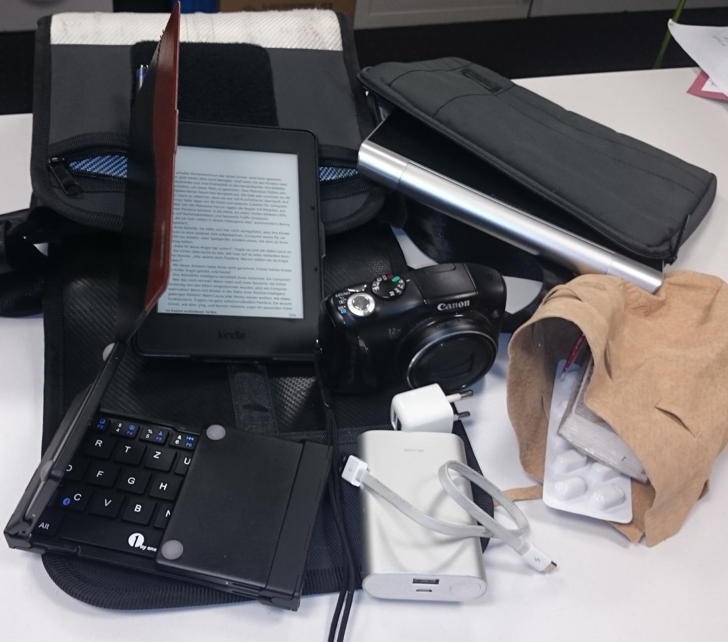 Hauptsächlich bedeutet das: E-Reader, Fotoapparat, Powerbank, kleine Bluetooth-Tastatur, Instant-Kaffee für alle Fälle (lebenswichtig!) und Kopfschmerztabletten (brauche ich eigentlich nie, aber nachdem ich im Studium einmal ohne da stand hab ich immer welche dabei).
