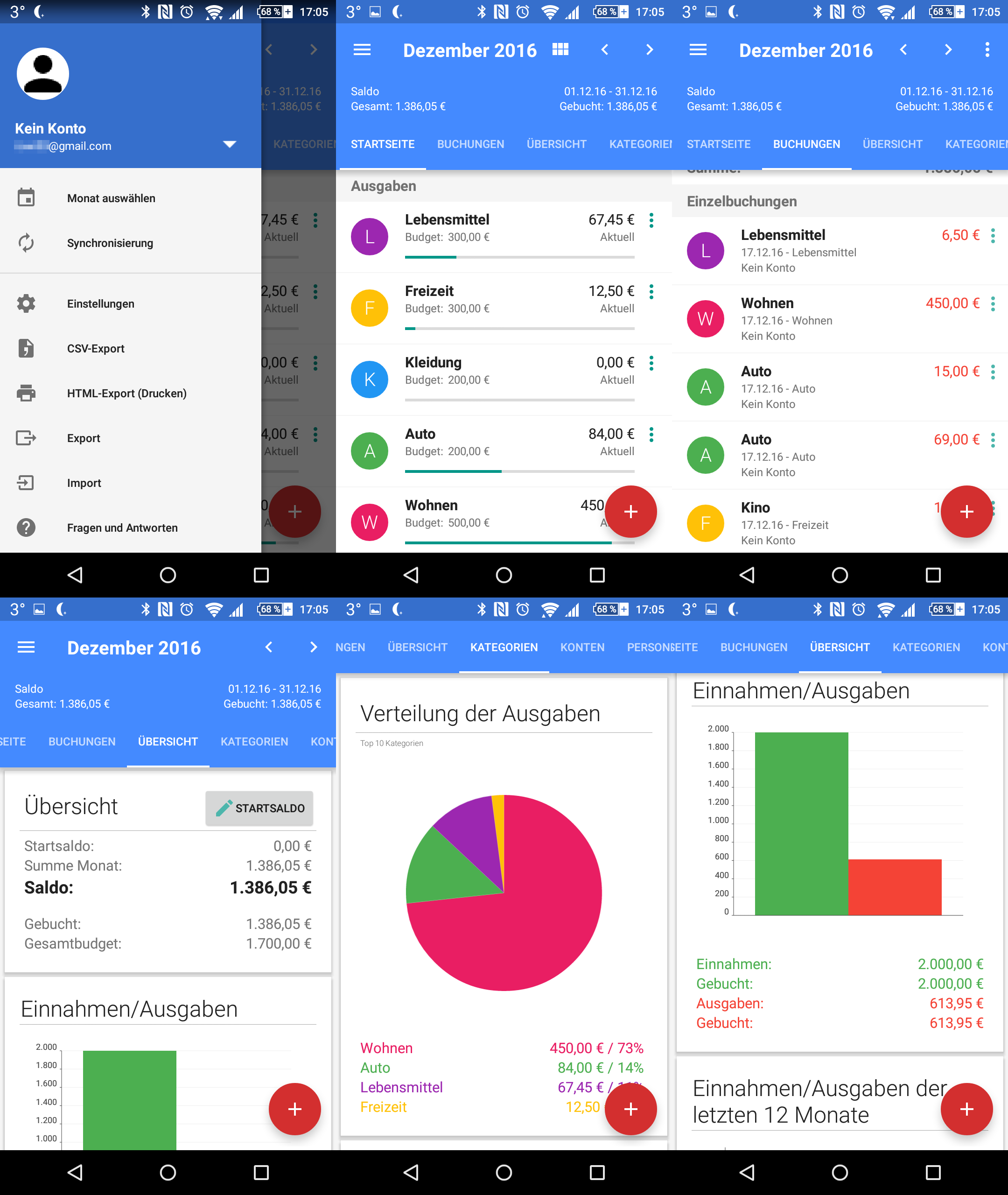 Trägt man so alle Ein- und Ausgaben ein (das kann man ja durchaus auch am Wochenende nachtragen) erhält man einen guten Überblick und Kontrolle über die Ausgaben. Dabei helfen auch diverse Auswertungen.