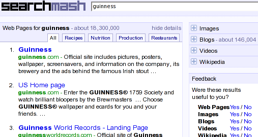 Ich bin da vor einigen Tagen über eine alternative Suchmaschine gestolpert, die ich sehr interessant finde. Es handelt sich dabei um Searchmash, eine Art Spielwiese von Google.