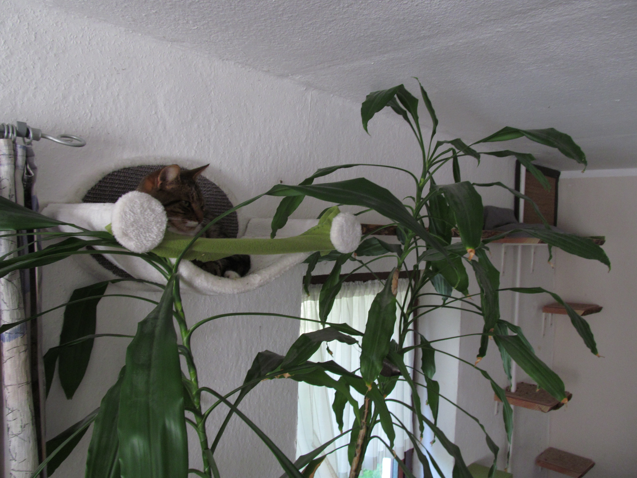 Wobei ich davon ausgehe, dass 90% einfach nur normales Verhalten von Katzen ist und sowieso so gekommen wäre. Wir haben immer beide Katzen gleichmässig beachtet und Rituale beibehalten. Tilly darf weiterhin bei uns rein kommen wenn wir da sind und wird Abends in ihren Anbau gebracht und bekommt ihr Leckerli, wenn sie durch ihre Klappe gegangen ist. Tuffi hat ansonsten die Wohnung und uns für sich allein, wenn Tilly da ist lässt er sie auf dem Sofa schlafen und er legt sich in die Hängematte und beobachtet von oben. Die Hängematte scheint aber unabhängig von ihr sein aktueller Lieblingsort zu sein.