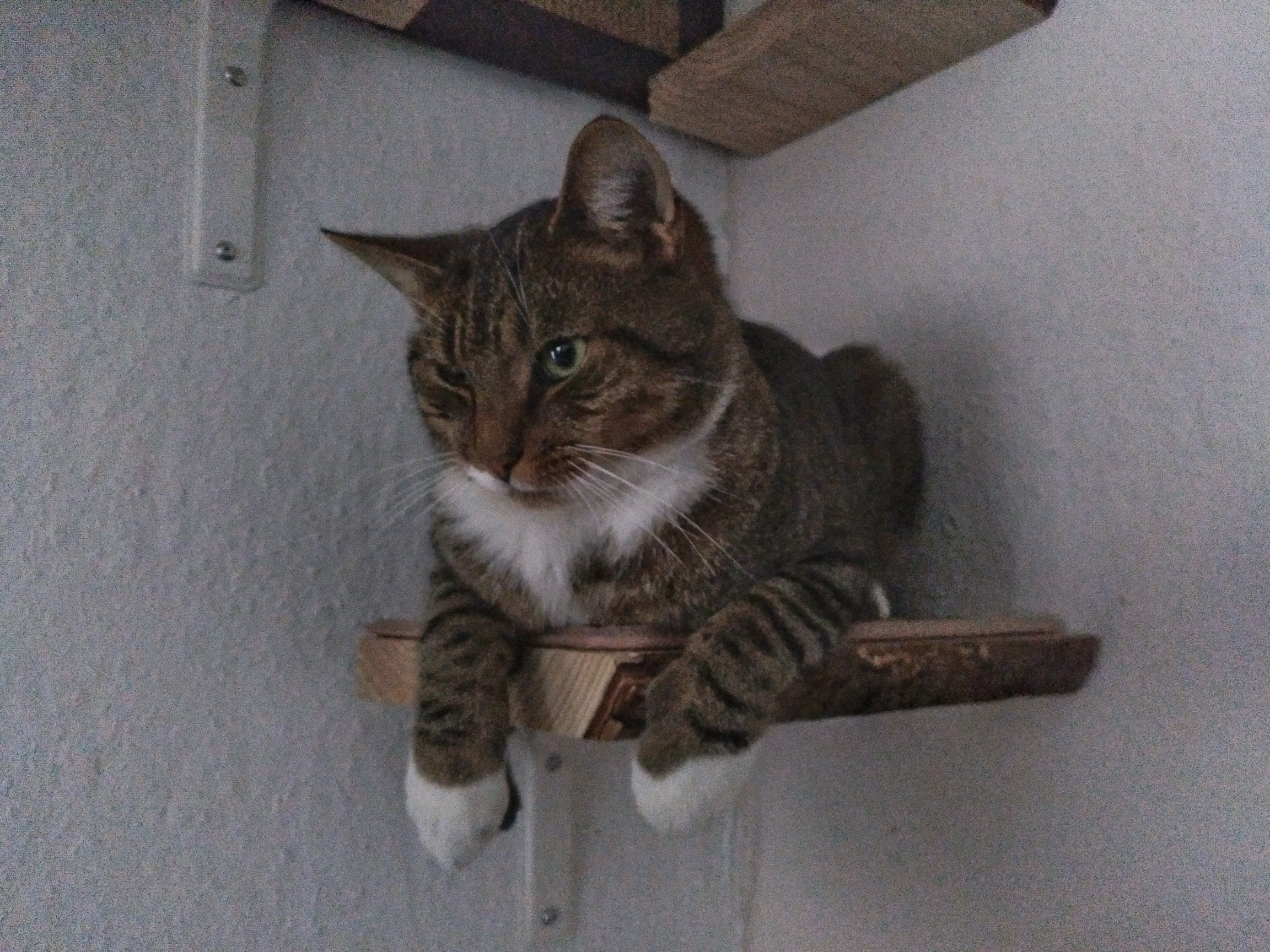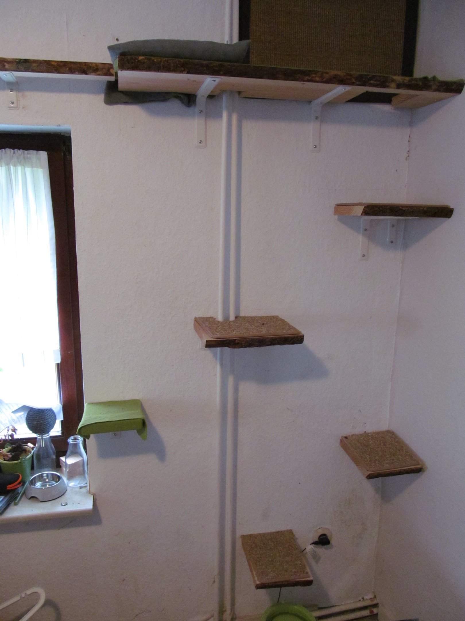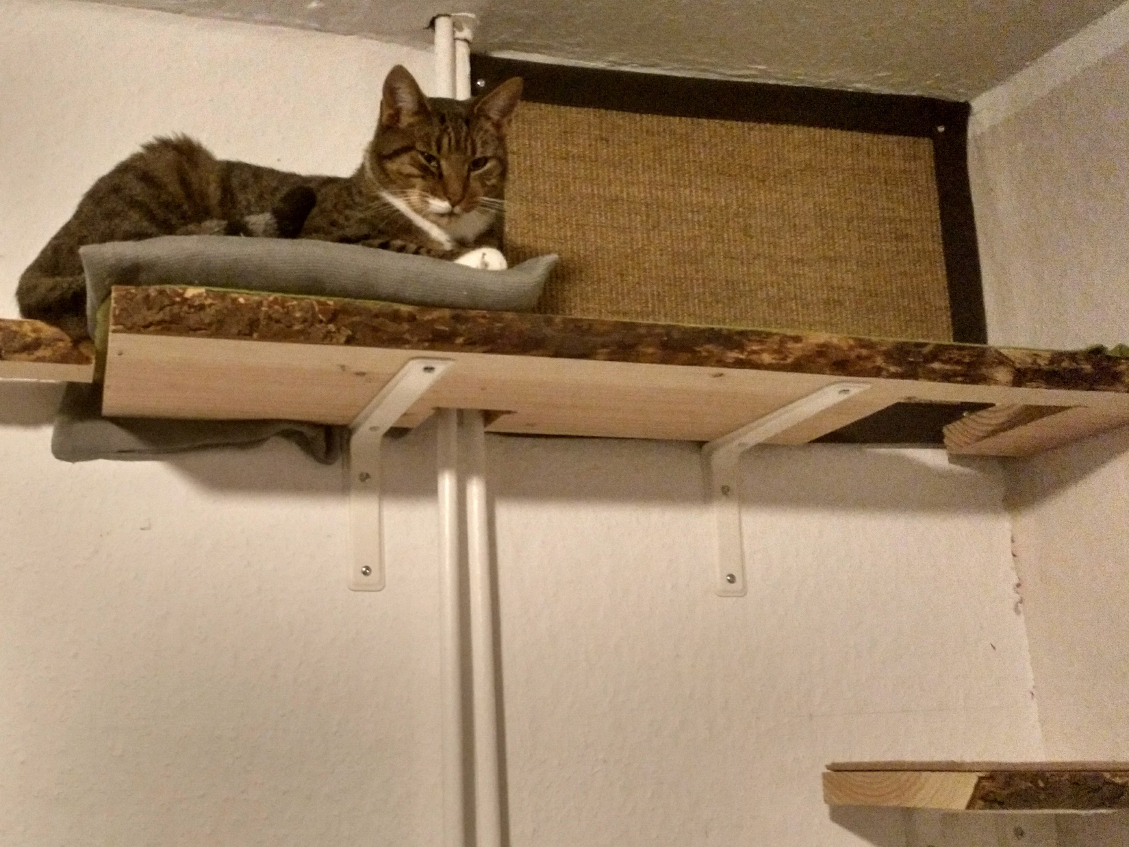 Fertig montiert ist bei den Heizungsrohren in der Raumecke nun also ein 1m breites Brett, darunter zwischen Ecke und Heizungsrohren 4 Stufen, alle 40cm-50cm Abstand in der Höhe zueinander. Das 20×20cm Stück, das ich aus dem Liegebrett ausgeschnitten hatte, ist als 5. Stufe auf dem Weg von der Fensterbank zur nächstgelegenen Treppenstufe. Letzteres hat sich aus der Beobachtung ergeben, da er auch regelmässig von der Fensterbank aus auf den Catwalk ging. Beim Aufstieg passte zudem noch genau ein Sisalteppich über das Liegebrett an die Wand.