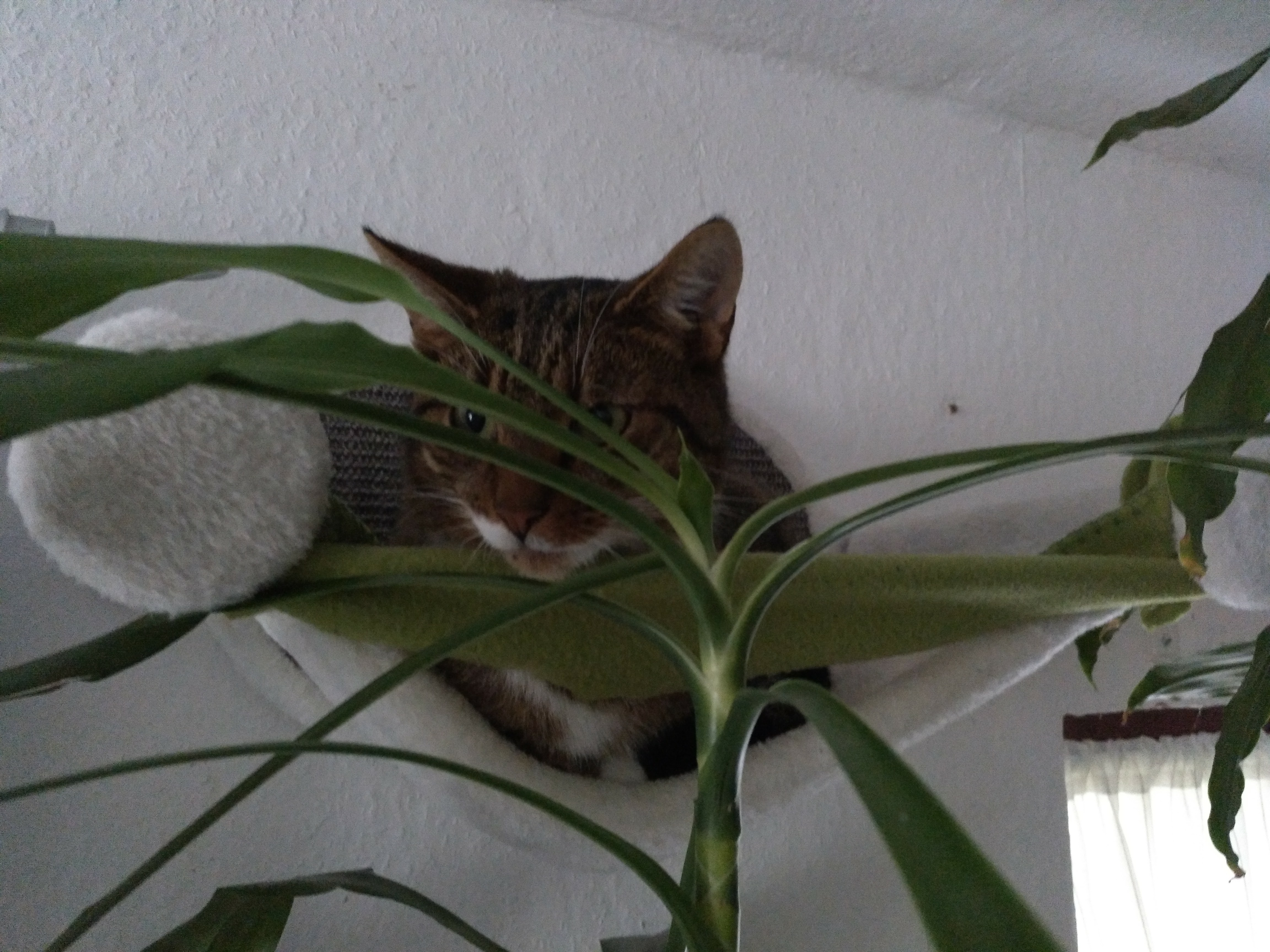 Seitdem geht er ständig auf den Catwalk und praktisch immer auch gezielt zur Hängematte. Er beobachtet uns oder die Gastkatze von oben, meistens legt er sich aber einfach nur hin zum schlafen oder dösen. Auch die Akrobatikeinlagen von oben hat er seitdem nicht mehr gemacht, er geht gezielt die Stufen hoch und weiter zur Hängematte.