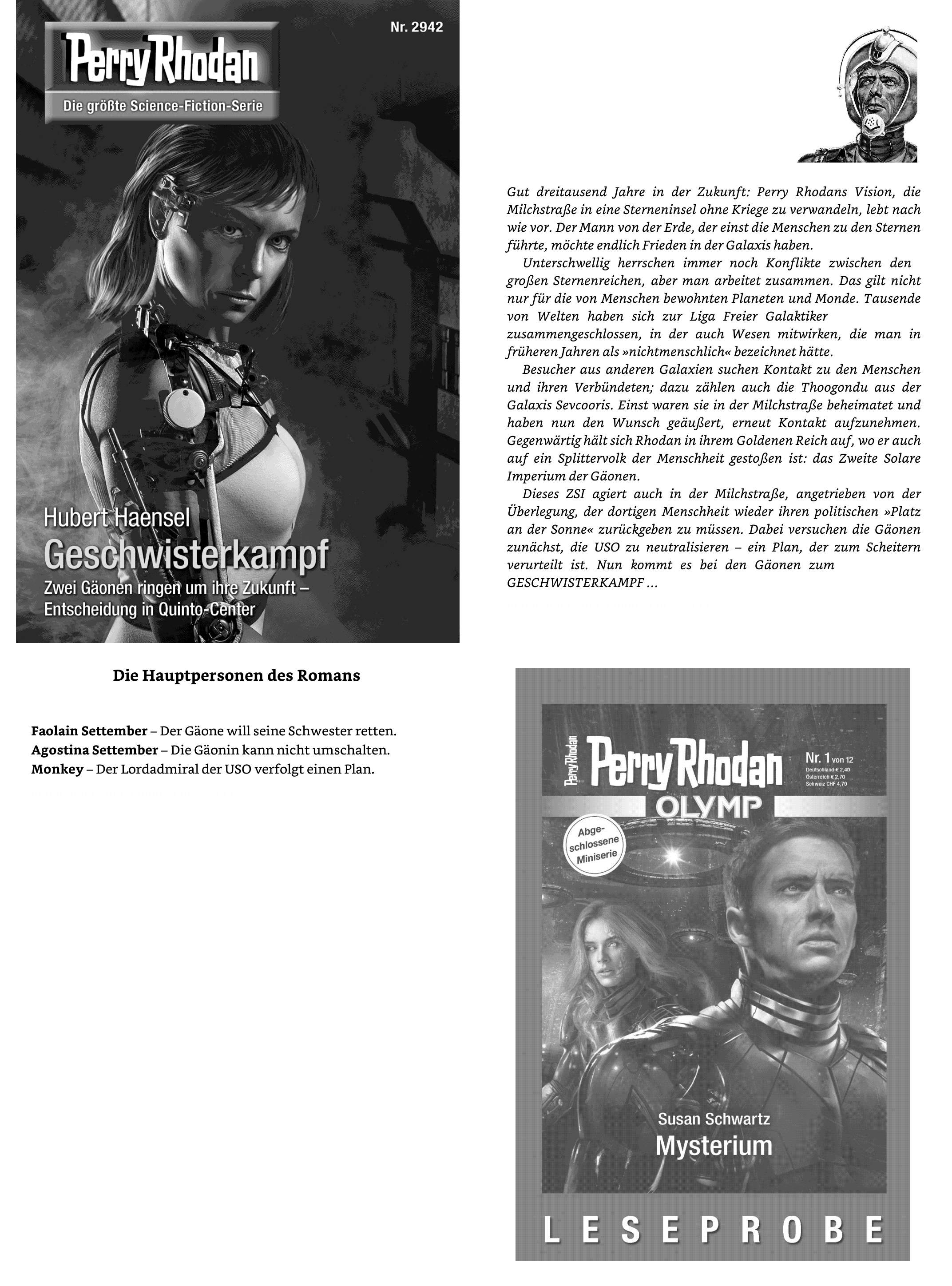 Am Ende des Heftes findet sich eine Leseprobe der neuen abgeschlossenen Miniserie Perry Rhodan Olymp, von der Freitag der erste Band in den Handel kommt. Über Olymp habe ich noch gar nichts geschrieben, das muss ich gleich mal nachholen