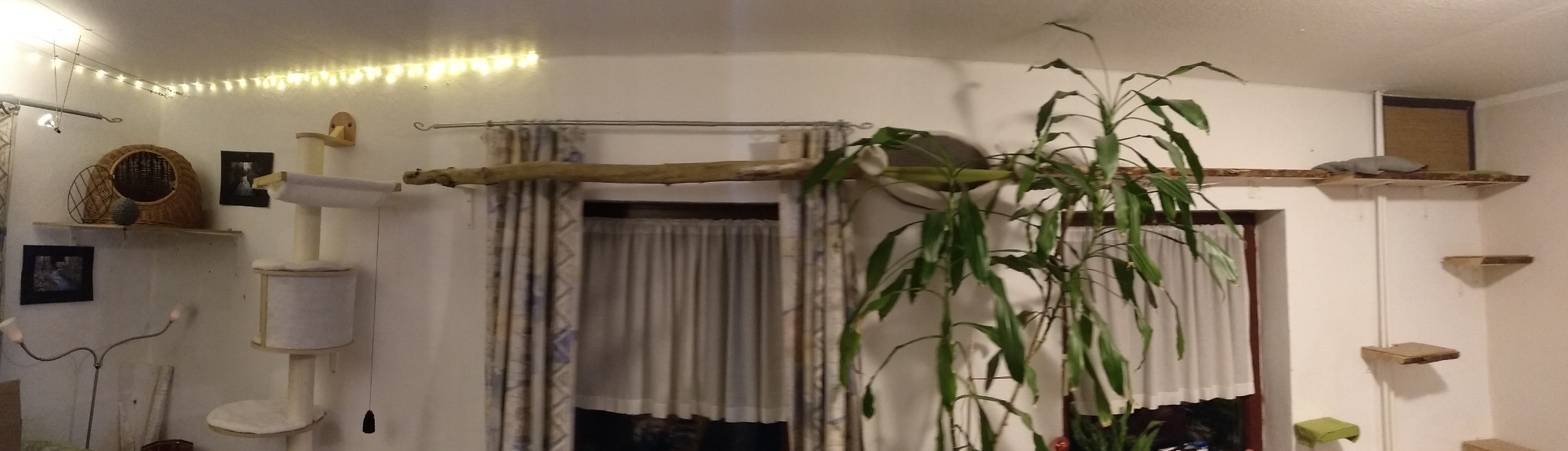 Da gab es diesen Kratzbaum zum an die Wand tackern für ~55€ und der ist als weiterer Kernpunkt neben dem zweiten Fenster an die Wand gekommen. Dazu dann noch das Brett für den Weidenkorb und alles verbunden mittels einem armdicken Ast.