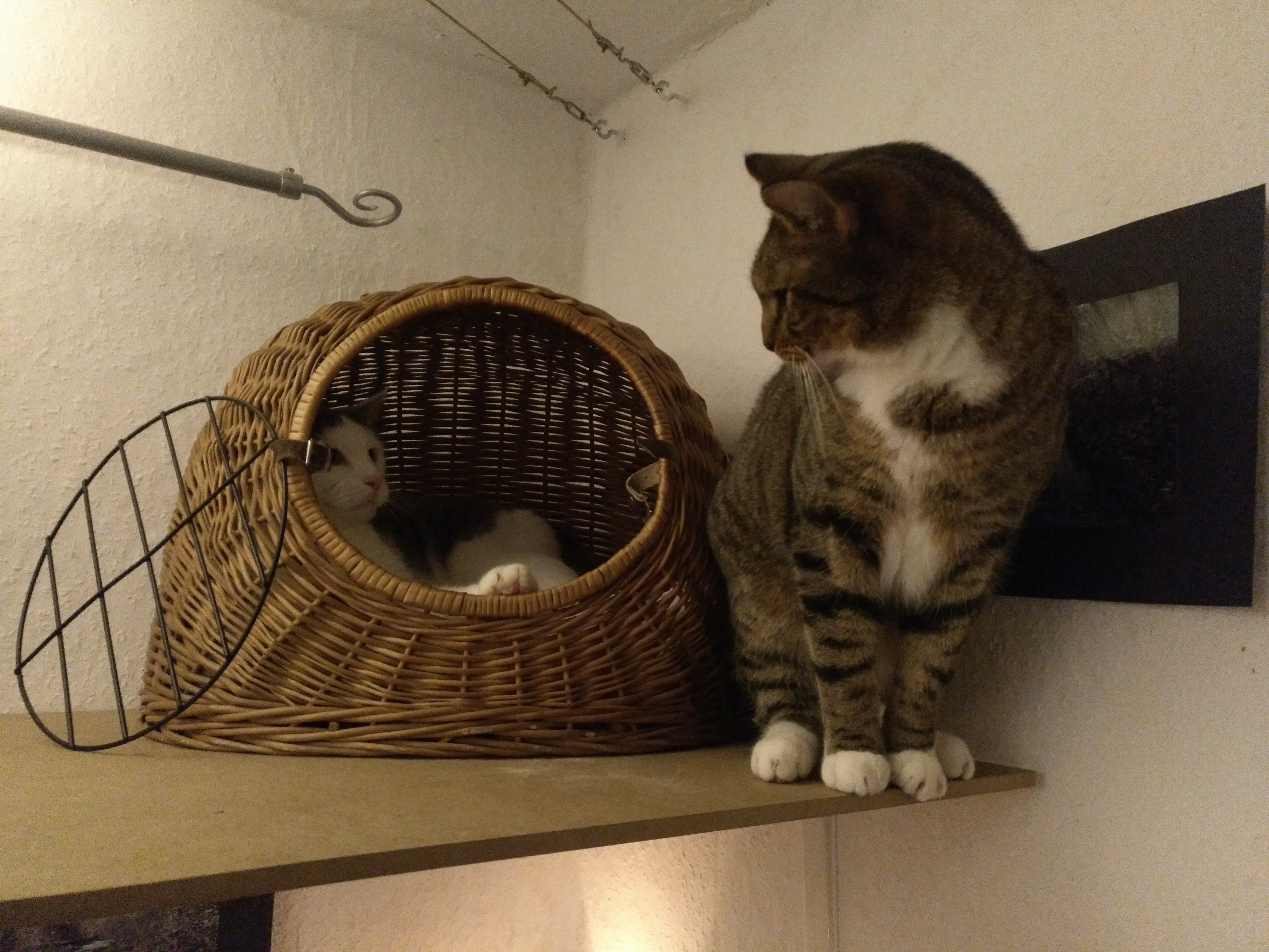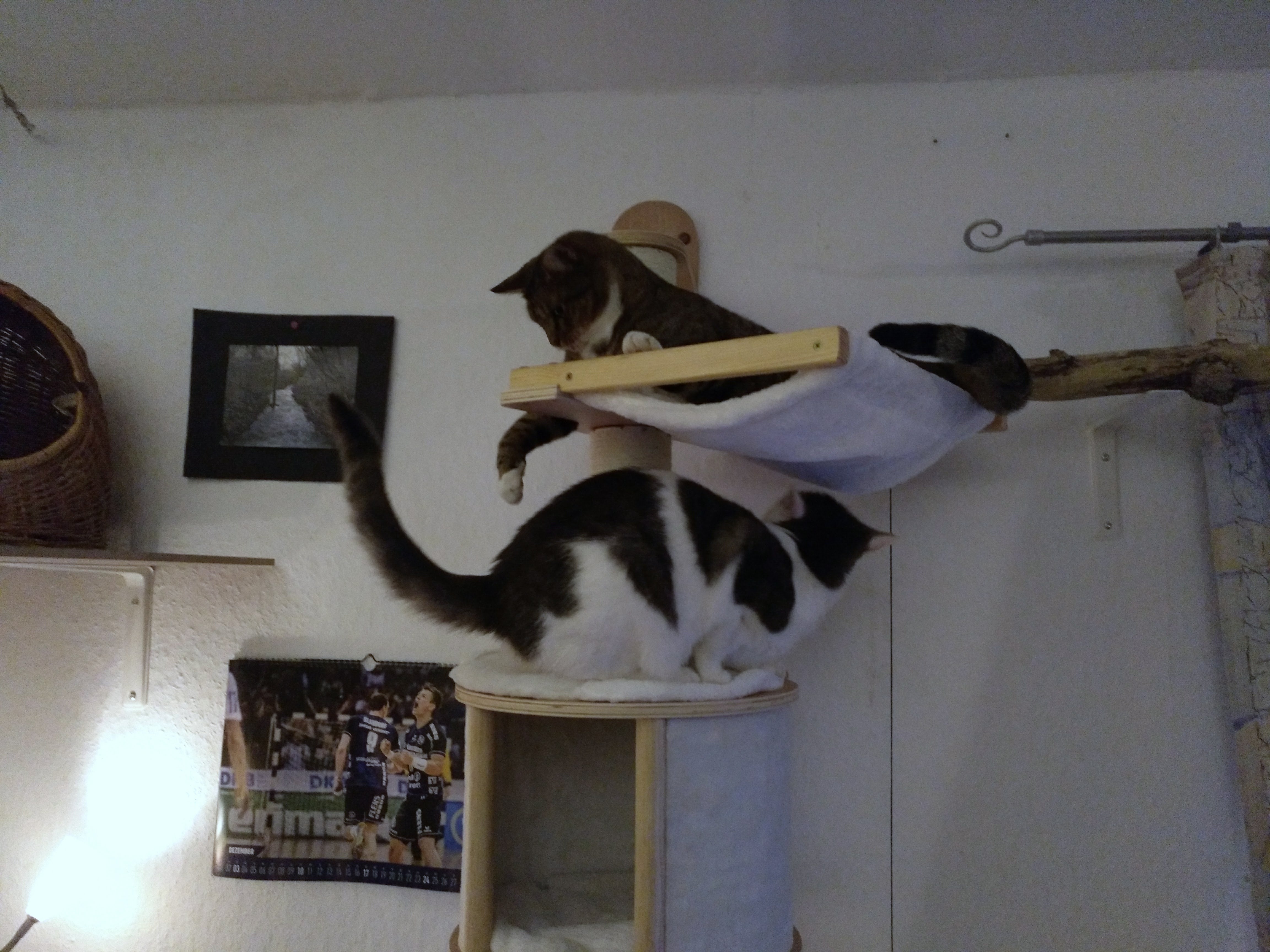 Allgemein nutzen sie alles an Konstruktionen, die wir besorgen. Das ist nun auch nicht jede Woche etwas neues und dann auch nicht “irgendetwas”, sondern wir achten auf Tuffis verhalten und was ihn anspricht. Dass Tilly die Sachen mitnutzt ist völlig in Ordnung (abgesehen vom Futter), aber sie sind für unseren Kater. Tilly ist nur Gast, auch wenn sie das manchmal anders sieht