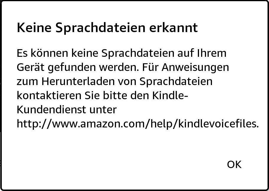 Zusammen mit dem schon gebloggten Adapter auf Micro-USB steckt man das Ding direkt in den Kindle und bekommt sofort die Meldung, dass die Sprachdateien für die Sprachsynthese fehlen. Diese kann man unter www.amazon.com/help/kindlevoicefiles als 130MB großes Update-Paket herunterladen. Auf dem Gerät selbst nehmen die Daten ~150MB zusätzlich ein und nach einem weiteren Neustart ist VoiceView einsatzbereit.