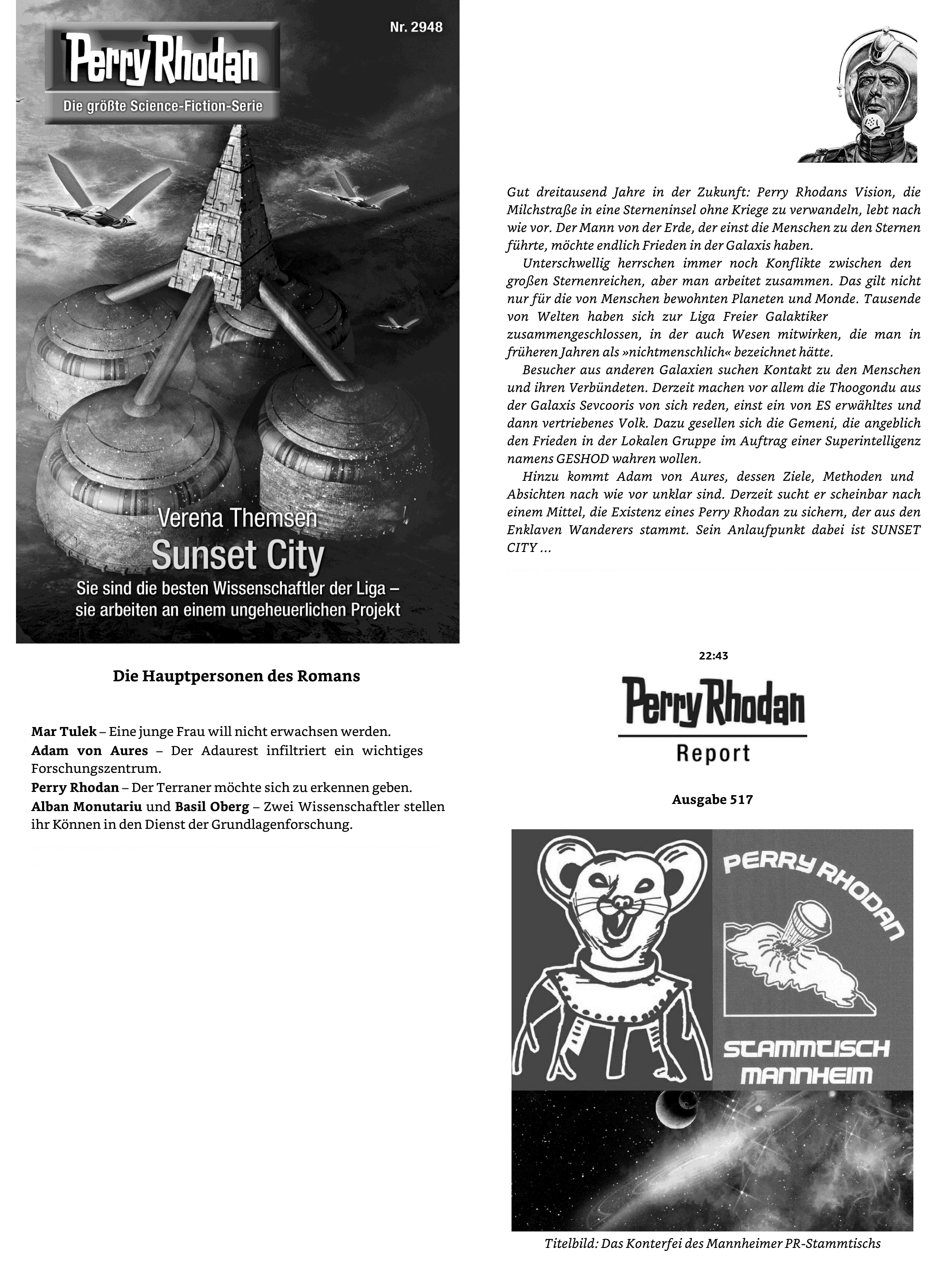 Weiterhin versucht Adam von Aures, die Wanderer-Version von Perry Rhodan dem “echten” anzugleichen. Dazu begeben sich beide nach Sunset-City, eine Forschungsstation auf dem entlegenem Planeten Last Hope.
