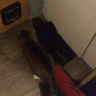 Denn seit einiger Zeit versucht der orangefarbene Kater, durch die chipgesicherte Katzenklappe rein zu kommen. Erfolglos, aber sehr ausdauernd und laut. Die Klappe sichert mit einem Sperrriegel den Eingang, nach draußen geht es immer. Der Garfield hat das gemerkt und versucht durch Schläge gegen die Klappe, sie nach außen zu öffnen. Das klappt nicht, aber ist durchaus laut.