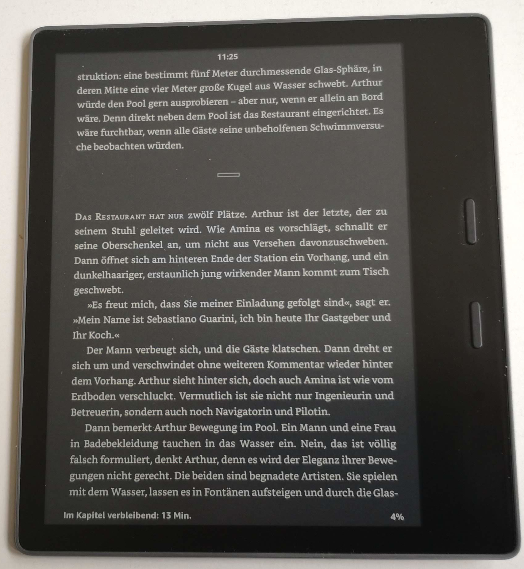 Durch das größere Display passt natürlich mehr Text auf die Seite. Das fällt erstmal kaum auf, aber ist sehr deutlich, wenn man zum Vergleich auf einen 6” Reader blickt. Dadurch, dass der Reader eine plane Oberfläche hat, wirkt die anzeige auch “Buchiger”. Die etwas versenkten Displays von Paperwhite und Co. sind im Gesamtbild doch anders. Die Darstellung auf dem Display selbst ist natürlich auch auf einem 6” Reader mit 300ppi gestochen scharf und wie gedruckt.