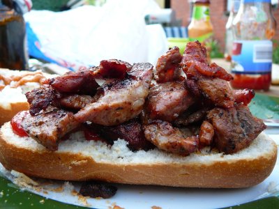 Ziel der Begierde waren Grillfleischstückchen, halt die Reste die bei der Verarbeitung so anfallen. Rest hin oder her, war jedenfalls mariniert und hat quasi nix gekostet (50ct oder nen Euro für ~450g) und lies sich perfekt auf’s Brötchen stapeln: