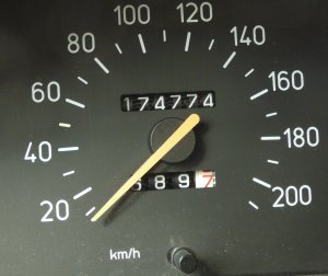 Wohl nur Männer können sich am Tacho erfreuen das komplett in Normschrift beschriftet ist. Der Tacho ist zudem von der angenehmen Sorte: Der Wagen ist mit 200km/h eingetragen, das ist gleichzeitig auch die letzte Beschriftung m Tacho, einen weiteren Strich gibt es noch bei ca. 210km/h. Angeben hat der Wagen nicht nötig, im Gegensatz zu manch modernem Kleinwagen der nur 160km/h erreichen kann aber einen Tacho hat der bis 250km/h reicht.Der Verbrauch liegt bei 8-9l/100km, unter die 8l bekomme ich ihn kaum, dafür auch kaum über 9l, das macht es ganz angenehm, er hat seinen Mindestverbauch und mehr als das gönnt er sich auch kaum. Das schont das Portemonnaie. Ebenso wie die Typklasseneinstufung, angenehm niedrig. Schadstoffarm ist er auch nach D3, was preislich Euro 2 entspricht und sich auf 135/Jahr summiert. Insgesamt gesehen ist er im Unterhalt deutlich niedriger als die Meissten Leute vermuten.