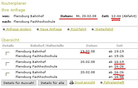 Da bekam ich grad per ICQ die Frage, wie man vom Bahnhof per Bus zur FH kommt. Da fährt alle 20min die Linie 5, aber wann wusste ich nicht auswendig. Also schnell mal bei Aktiv-Bus nachgesehen. Die Suchmaske ist zwar seit der Umstellung auf Hafas etwas suboptimal (warum muss ich da “Flensburg” jedes mal eingeben und warum ist da das aktuelle Datum und Uhrzeit nicht vorausgefüllt?) aber an sich funktioniert das Ding ganz gut.