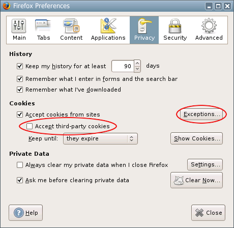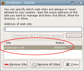 Nachtrag: Wenn du dich zwar auf der Community-Webseite bei sixgroups aber nicht in dem Balken oben anmelden kannst kontrollier mal in den Cookie-Einstellungen ob du Kekse von Drittanbietern annimmst. Also von sixgroups.com wenn du eigentlich auf standardleitweg.de bist. Das entweder generell oder für sixgroups.com erlauben. Für Firefox3 hab ich das mal auf den Screenshots markiert