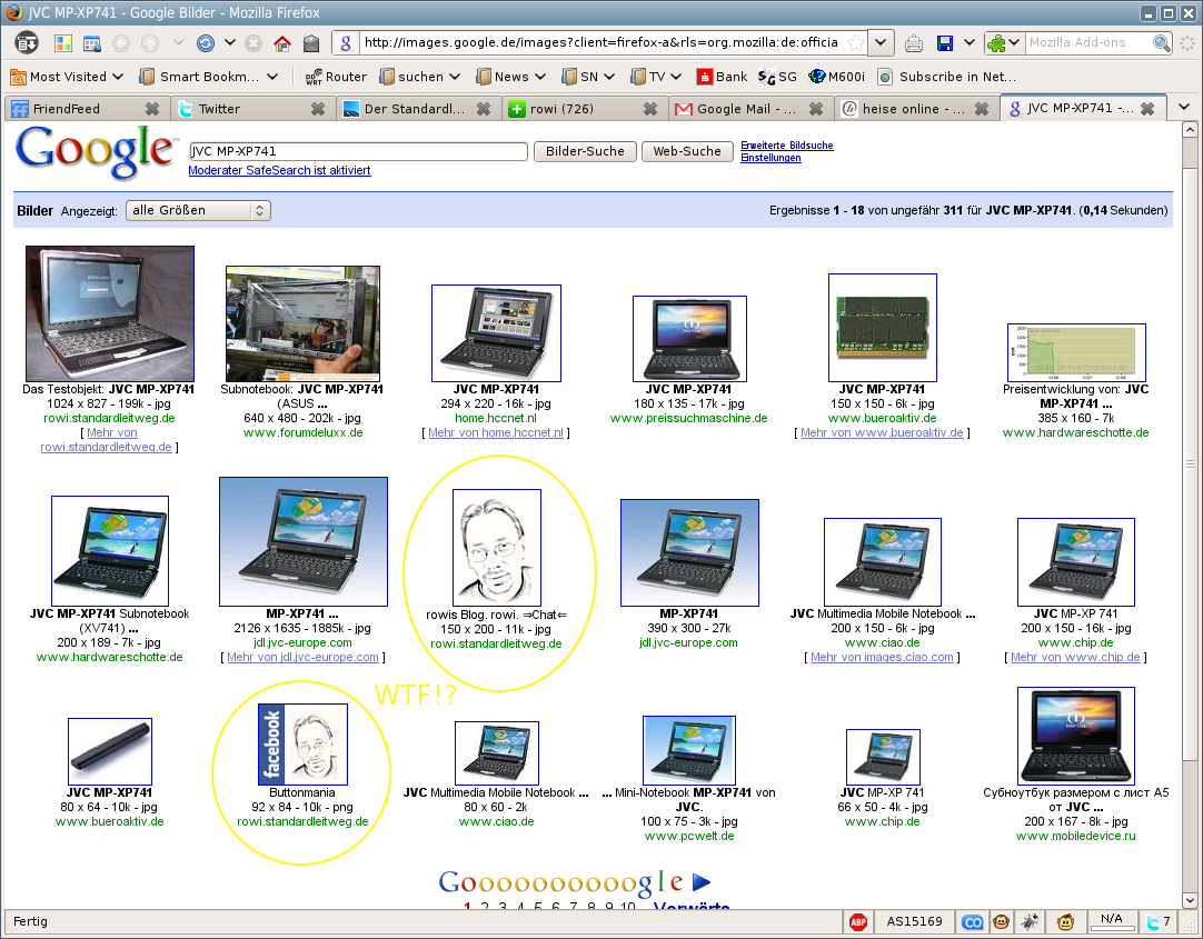 Gödi machte mich auf etwas merkwürdiges aufmerksam: sucht man bei google images nach Bildern meines Notebooks, dem JVC MP-XP741, so sieht man viele Bilder von dem Gerät. Gleich das Erste kommt sogar von diesem meinem Blog, aber mittendrin ist auch mein Gesicht.