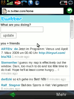 Twitter macht erst dann richtig Spaß wenn man es von überall nutzen kann (nicht muß). Für den mobilen Zugriff bietet sich das Handy an. In den USA gibt es die tweets per Kurznachricht (einstellbar), hierzulande muss man sich anders behelfen. Das finde ich ehrlich gesagt auch gar nicht schlecht, ich will gar nicht immer und überall durch eine Kurznachricht von unwichtigem wie twitter gestört werden.