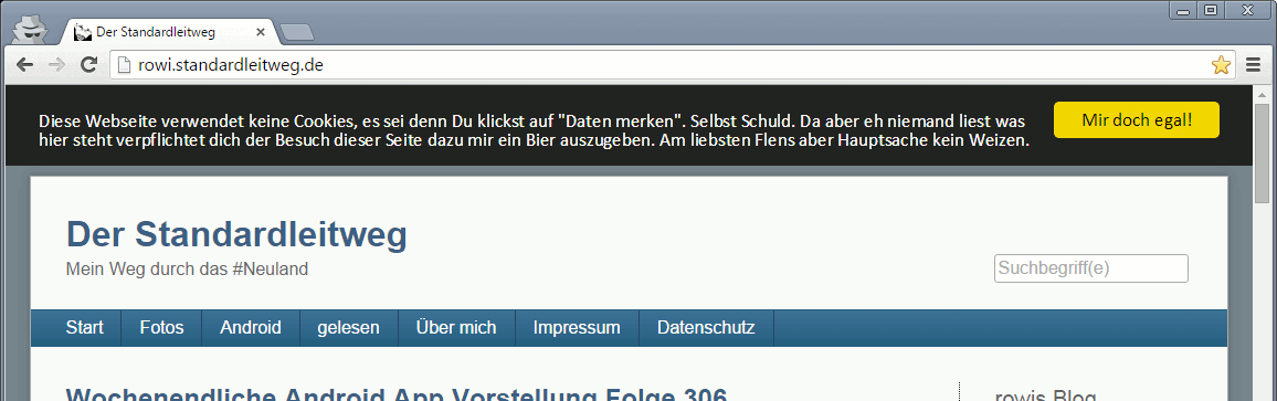 Die Seite setzt zwar keine Cookies (es sei denn, du klickst beim kommentieren auf “Daten merken”, was recht offensichtlich ist) aber da eh niemand liest was in diesen Bannern steht hab ich mir gedacht ich verpflichte einfach jeden Besucher mir ein Bier auszugeben. Vielleicht klappt’s ja und ich verbringe den Rest des Jahres im Vollrausch