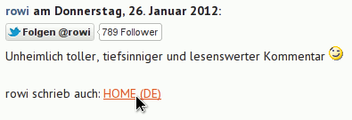 Der Twitter-Name wird momentan auch als Follow-Me Badge ausgegeben das die Anzahl der Follower anzeigt und über das man Dir direkt folgen kann. Ob das so bleibt muss ich mal sehen da es das Laden etwas verlangsamt. Verlinkt wird es aber auf jeden Fall.