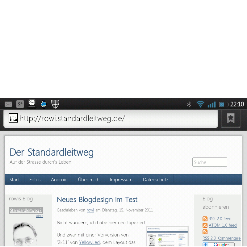 Quer hat man das gleiche dreispaltige Layout wir auf dem PC, im Hochformat ist es einspaltig (die Seitenleisten folgen unter den Artikeln) und die Navigation wird zu einer Dropdown-Liste. Sehr genial! YellowLed ist schon ein Zauberer Nachtrag: Die Einstellung “Standard-Zoom” im Android-Browser stand auf “Entfernt”, dadurch die dreispaltige Ansicht. Auf “Mittel”, wie es standardmässig glaube ich ist, ist die Darstellung weiterhin einspaltig aber halt mit normaler Navigationsleiste.