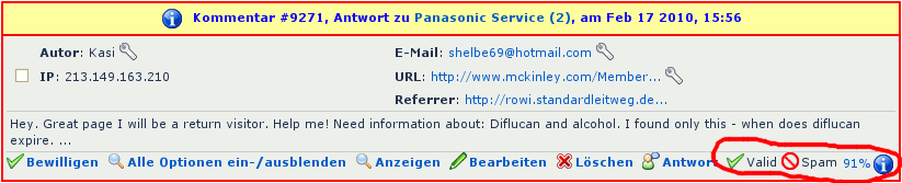 Mit den beiden Links “Valid” und “Spam” kann man jeden Kommentar von Hand klassifizieren und den Filter anlernen.